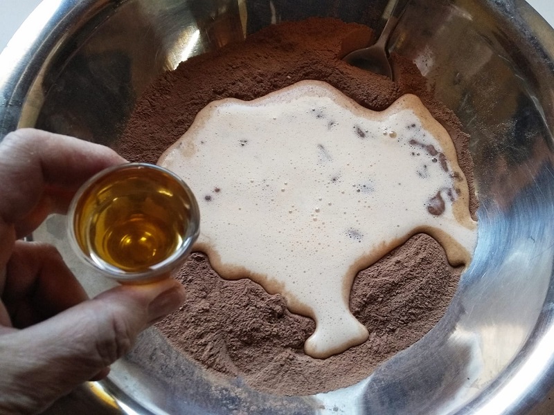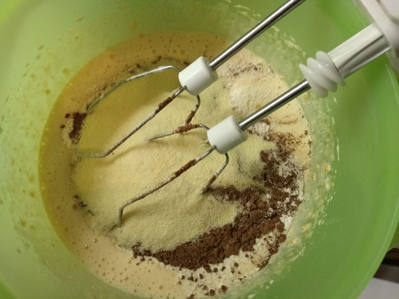 Ρίχνουμε το μίγμα κρόκων-ζάχαρης στα στερεά υλικά και ανακατεύουμε καλά.