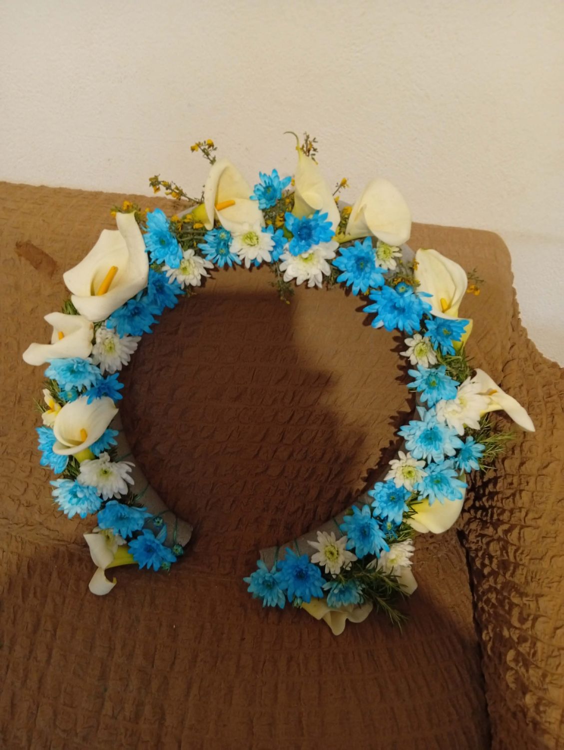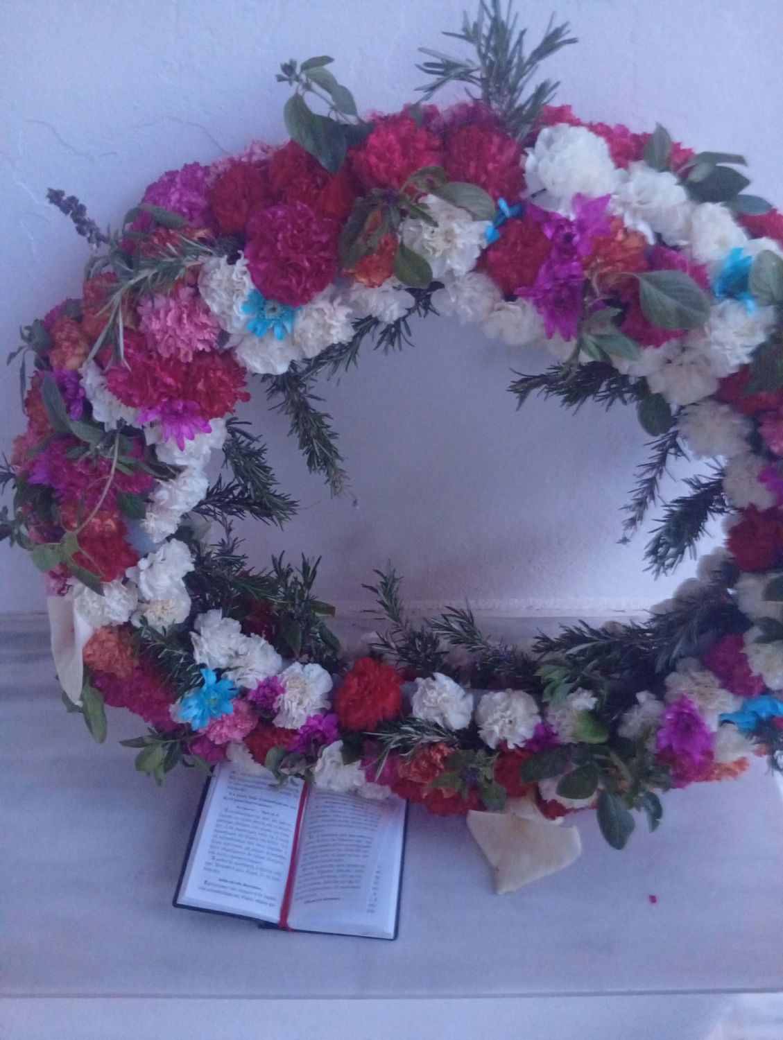 Επιτρέψτε μου να κάνω μια επισήμανση που δεν σας κρύβω ότι με εντυπωσίασε. Πρόκειται για τα στεφάνια που έφερε η καλή μου ξαδέρφη κ. Νίκη Σπυριδογιαννάκη-Μπιτσακάκη, τα οποία αφενός ήταν χειροποίητα έργα τέχνης και αφετέρου ήταν κατασκευασμένα με λουλούδια από τις γλάστρες της και την Βιαννίτικη φύση!!!