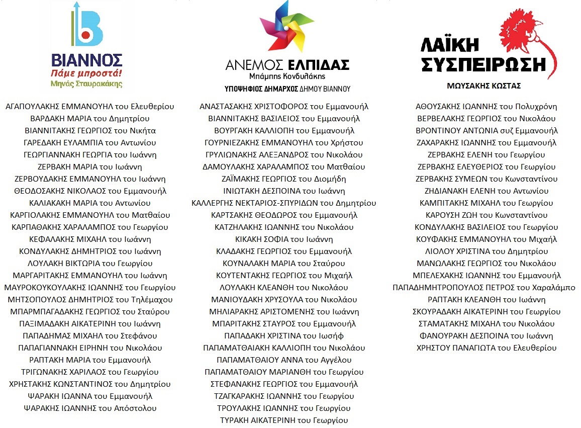 Μηνάς Σταυρακάκης, Μπάμπης Κονδυλάκης και Κώστας Μωυσάκης, είναι τελικά οι τρεις διεκδικητές του δημαρχιακού θώκου, μετά την απόσυρση του συνδυασμού του Μανώλη Αναστασάκη, ο οποίος στις 2 Φεβρουαρίου είχε ανακοινώσει πως ενδιαφέρεται να διεκδικήσει για τέταρτη φορά τον Δήμο Βιάννου.