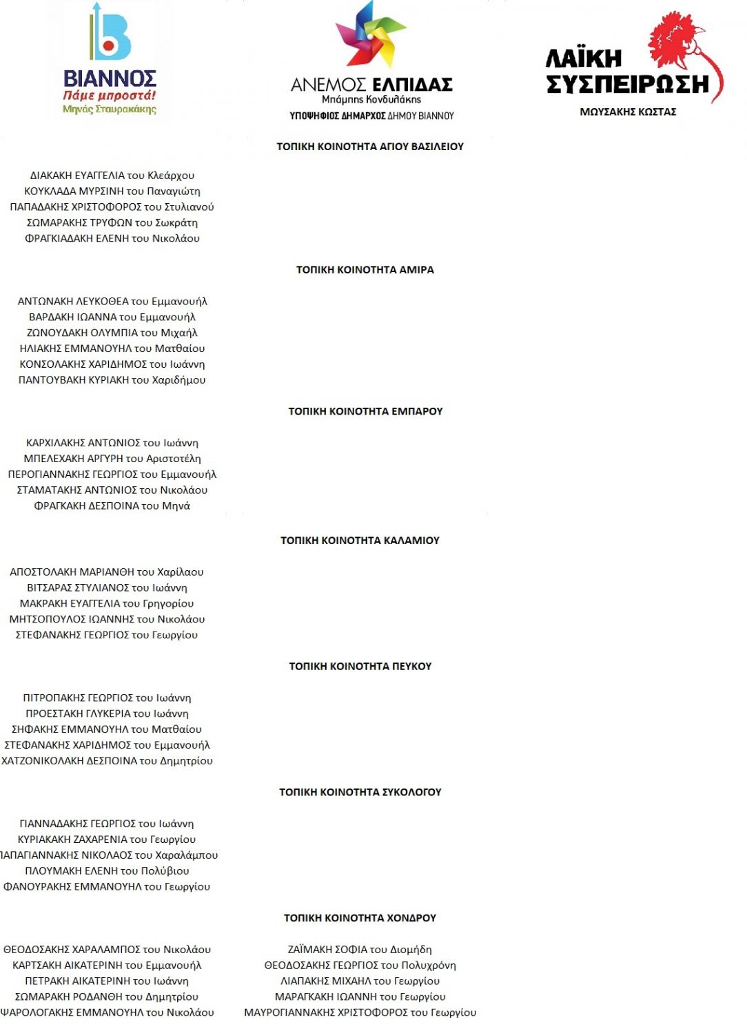 Παρακάτω, σας παραθέτουμε όλες τις λίστες των υποψηφίων δημοτικών και κοινοτικών συμβούλων(πλην των κοινοτήτων όπου εκλέγεται ένα άτομο):