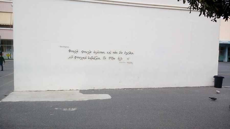 Ως εκ τούτων, αξίζουν πολλά «μπράβο» σε όποιον ή όποια είχε την φαεινή ιδέα να γραφτεί ένα από τα δέκα τόσες χιλιάδες δίστιχα του ποιήματος, στον τοίχο του σχολικού συγκροτήματος σ’ ένα ιστορικό κτίριο που για πολλά χρόνια στέγασε την Παιδαγωγική Ακαδημία Ηρακλείου: