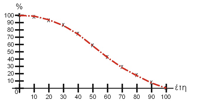 Σκανδαλισμό, για να επαναφέρω στη μνήμη μου τον Γκάους και την κωδωνοειδή καμπύλη του, μετά από 55 χρόνια απουσίας από τα φοιτητικά θρανία, ήταν το τρανταχτό γέλιο φίλου μου γιατρού, όταν του γνωστοποίησα την πρόθεσή μου, πριν τον εμβολιασμό μου για COVID-19, να κάνω εξέταση αντισωμάτων, μήπως ανήκω στην ευτυχή ομάδα ασυμπτωματικών και επομένως δεν είναι αναγκαίος ο εμβολιασμός μου. Αποφάσισα, λοιπόν, να υπολογίσω χονδρικά, σύμφωνα με την κανονική κατανομή, τις πιθανότητες ογδοντάχρονων ατόμων, να είναι ασυμπτωματικοί στον COVID-19,με στοιχεία μετρήσεων που συνέλεξα από το ιντερνέτ. Αυτονόητα, έθεσα οριακές τιμές το μηδέν έτος, με (σχεδόν) 100% ασυμπτωματικά άτομα (βρέφη), και τα εκατοστό έτος με (σχεδόν) 0% ασυμπτωματικούς (υπερήλικες). Τα αποτελέσματα των πρόχειρων υπολογισμών μου απεικονίζονται στην παρακάτω ημικωδωνοειδή καμπύλη.