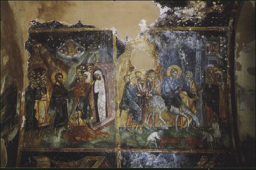 Στη νότια πλευρά της καμάρας εικονίζεται η Γέννηση, η Υπαπαντή, η Βάπτιση και η Μεταμόρφωση του Χριστού στην ανώτερη ζώνη, ενώ στη μεσαία ζώνη η Προδοσία του Ιούδα, η άρνηση του Πέτρου και ο Παράδεισος της Δευτέρας Παρουσίας. Στην κατώτερη ζώνη της καμάρας σκηνές από το μαρτύριο του Αγίου Γεωργίου όπως ο Τροχός, η Ξέσις και Χοροί της Δευτέρας Παρουσίας.