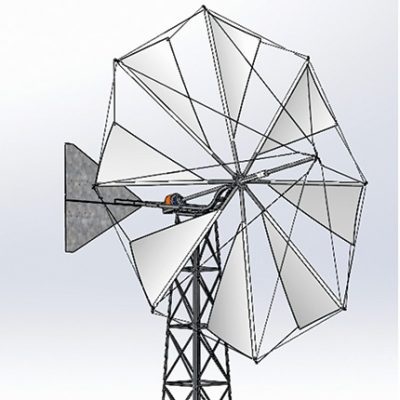 Ο Ανεμουργός στην τελική του μορφή, διακρίνεται το ηλεκτρικό καλώδιο στη θέση της ρόκας της ανεμαντλίας. (Σχεδιάστηκε από τους Κονταξάκη Γιώργο και Χάμψα Γιώργο)