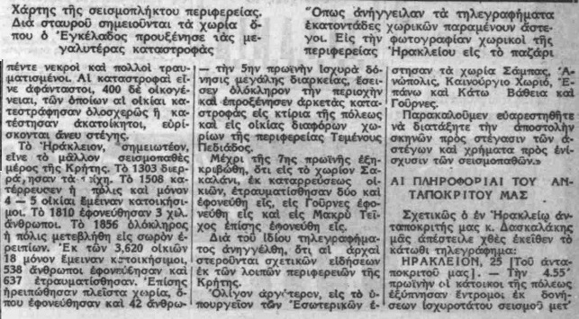 Ο σεισμός μεγέθους 7 Ρίχτερ, έστειλε 7 ανθρώπους στο θάνατο και προκάλεσε τεράστιες καταστροφές, τόσο στην πόλη του Ηρακλείου, όσο και στην ενδοχώρα.