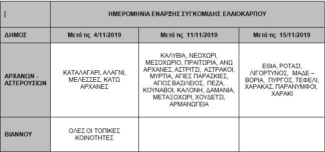 Οι ημερομηνίες έναρξης συγκομιδής του ελαιόκαρπου στις Τοπικές Κοινότητες (ΤΚ) της Περιφερειακής Ενότητας Ηρακλείου είναι οι παρακάτω: