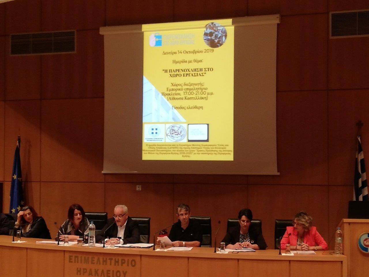 Η Περιφέρεια Κρήτης διοργάνωσε με επιτυχία την εσπερίδα με τίτλο, «Η Παρενόχληση στο Χώρο Εργασίας» στο πλαίσιο της προγραμματικής σύμβασης «Δράσεις Προώθησης Ισότητας των Φύλων στην Περιφέρεια Κρήτης 2018 - 2020» με τη σύμπραξη του Πανεπιστημίου Κρήτης και του Ελληνικού Μεσογειακού Πανεπιστημίου.