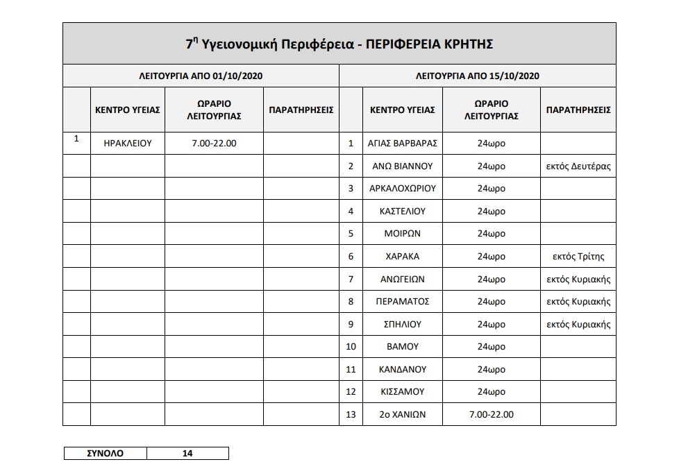 Από τις 12 Οκτωβρίου, λοιπόν, τίθενται σε λειτουργία 103 Κέντρα Υγείας σε όλη την Ελλάδα και επιπλέον 58 από τις 15 Οκτωβρίου, καθώς και 42 περιφερειακά ιατρεία. Ειδικά, στην Κρήτη, από τη Δευτέρα θα ξεκινήσουν 13 Κέντρα Υγείας, 14 μαζί με το Κ.Υ. Ηρακλείου που ξεκίνησε από την 1η Οκτωβρίου.