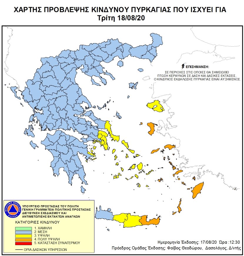 Συγκεκριμένα, σύμφωνα με το Χάρτη Πρόβλεψης Κινδύνου Πυρκαγιάς που εκδίδει η Γενική Γραμματεία Πολιτικής Προστασίας για σημερα προβλέπεται πολύ υψηλός κίνδυνος πυρκαγιάς (κατηγορία κινδύνου 4) σε Χίο, Σάμο, Ικαρία, Δωδεκάνησα και Λασίθι.
