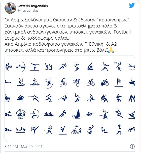 Έτσι, από την προσεχή Δευτέρα (22/3) μπορούν να γίνουν και πάλι αγώνες στην Α1 υδατοσφαίρισης ανδρών, την Α1 χάντμπολ ανδρών και την Α1 μπάσκετ γυναικών, από το Σάββατο 27/3 στην Α΄ Εθνική γυναικών της υδατοσφαίρισης και την Α1 χάντμπολ γυναικών και από την Κυριακή 28/3 στη Football League και την Α΄ εθνική του ποδοσφαίρου σάλας.