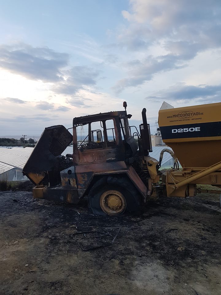 "Από τις κάμερες φαίνεται πως ήταν τουλάχιστον δύο οι δράστες, οι οποίοι έσπασαν τα παρμπρίζ των οχημάτων και πέταξαν μέσα τσουβάλια με πετρέλαιο. Έβαλαν φωτιά σε 7 μηχανήματα, εκ των οποίων μόνο ένα δεν έχει καεί. Μιλάμε για ανυπολόγιστη ζημιά"