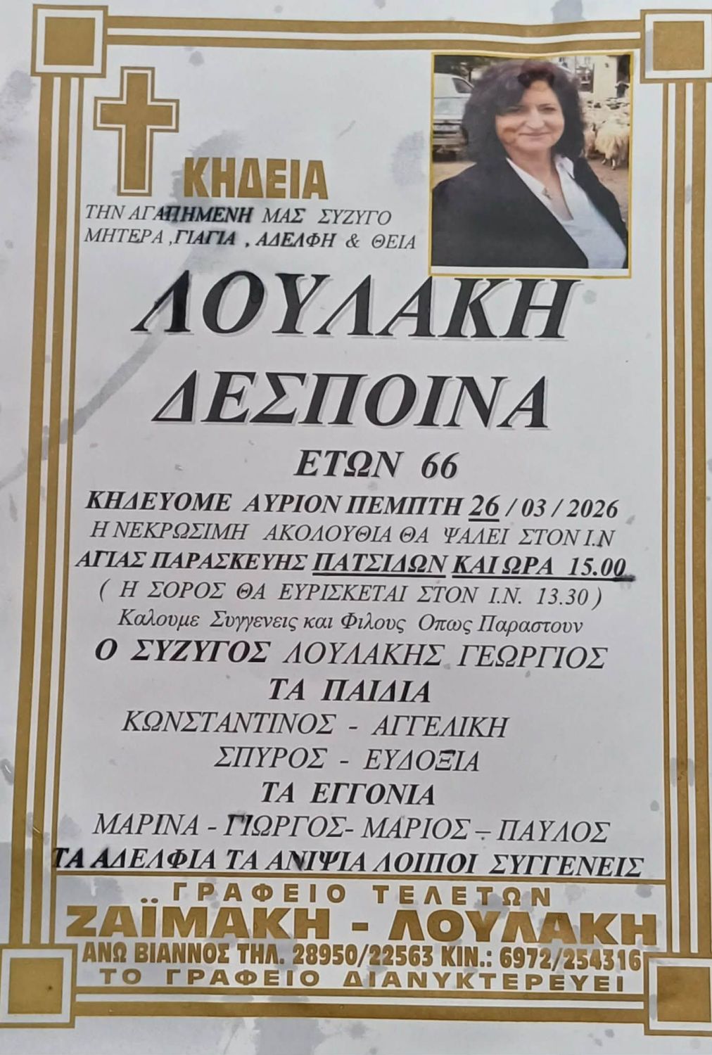 Σε ηλικία 66 ετών εγκατέλειψε τα εγκόσμια η Δέσποινα σύζυγος Γιώργου Κ. Λουλάκη. Η νεκρώσιμος ακολουθία θα ψαλλεί αύριο Πέμπτη 26 Μαρτίου και ώρα 3:00 μ.μ. στον Ιερό Ναό Αγίας Παρασκευής Πατσίδων. Η σορός θα ευρίσκεται στον ναό από ώρα 1:30 μ.μ.
