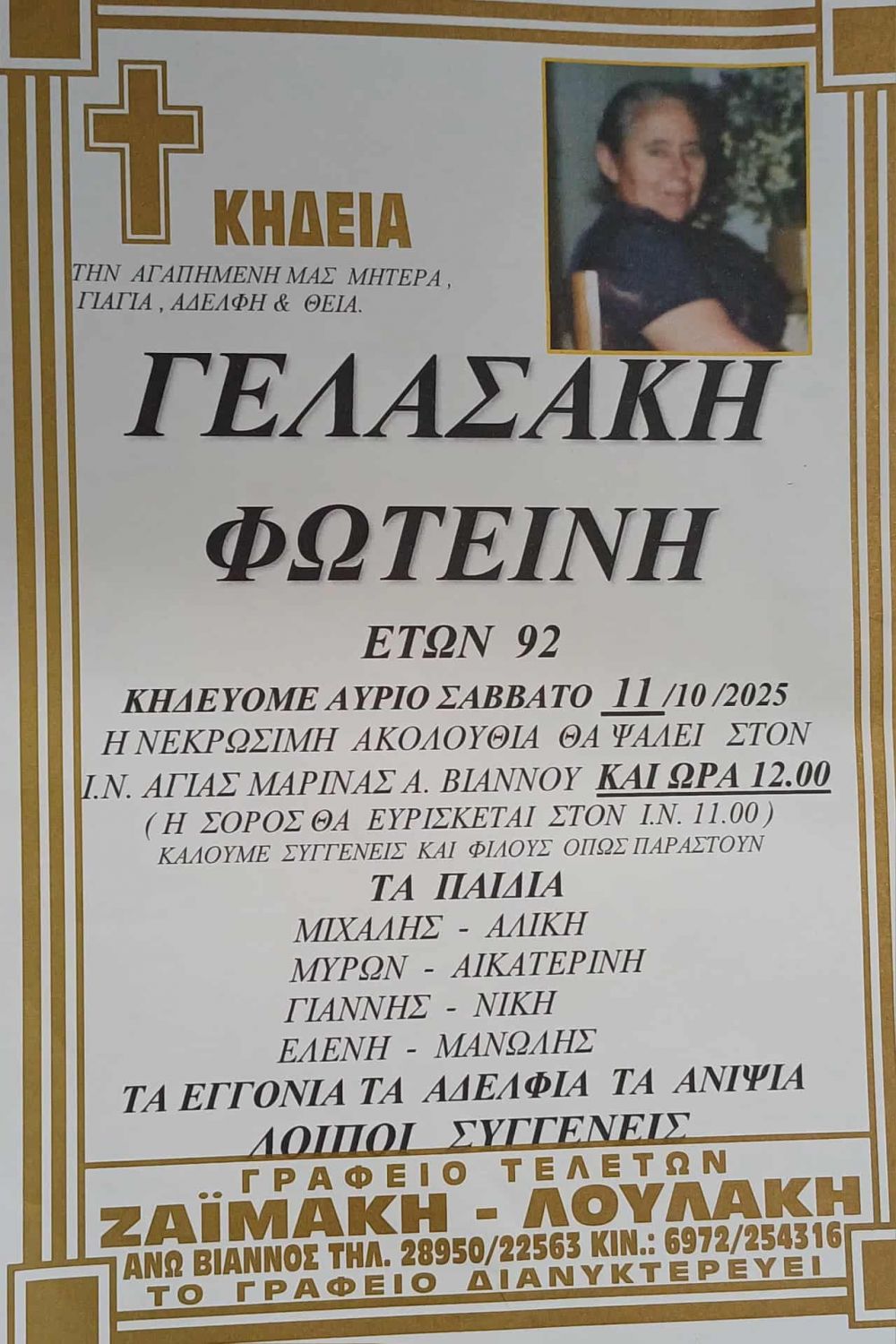 Σε ηλικία 92 ετών εγκατέλειψε τα εγκόσμια η Φωτεινή Ραπτάκη συζ. Εμμανουήλ Γελασάκη. Η νεκρώσιμος ακολουθία θα ψαλλεί αύριο Σάββατο 11 Οκτωβρίου 2025 και ώρα 12:00 στον Ιερό Ναό Αγίας Μαρίνας Άνω Βιάννου. Η σορός θα ευρίσκεται στον ναό από τις 11:00 π.μ.