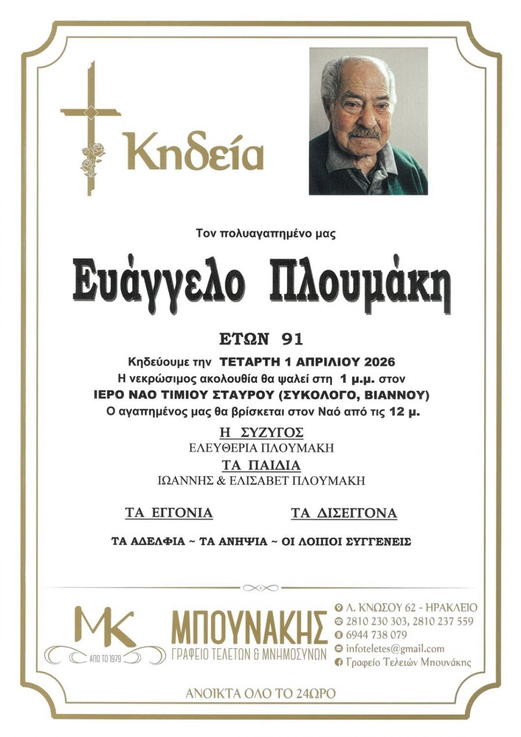 Σε ηλικία 91 ετών έφυγε από τη ζωή ο Βαγγέλης Πλουμάκης από τον Συκολόγο Άνω Βιάννου, σκορπίζοντας θλίψη στην οικογένεια, τους συγγενείς και τους συγχωριανούς του.