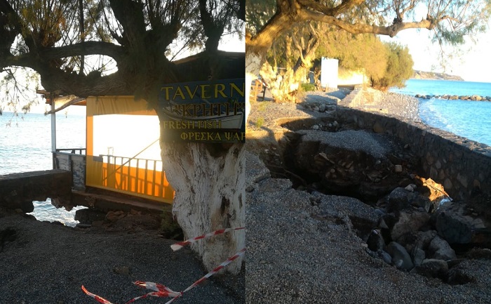 Κατεστραμμένα κομμάτια δρόμου, διαλυμένα τοιχία, εξωτερικοί χώροι από τις γραφικές ταβέρνες που "κρέμονται" στον αέρα. Αυτές είναι οι εικόνες που συναντάει κανείς από το αλιευτικό καταφύγιο μέχρι και το ανατολικότερο κομμάτι του Κερατοκάμπου, ένα μέτωπο δηλαδή σχεδόν τριών χιλιομέτρων.
