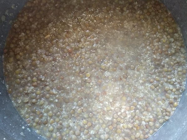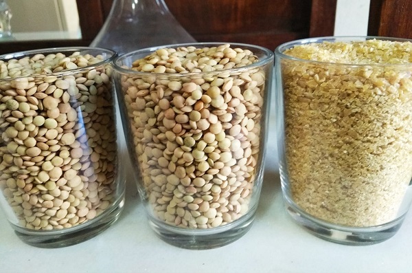 Βάζουμε στην κατσαρόλα το πλιγούρι και τις φακές και συμπληρώνουμε με νερό τόσο στο ύψος όσο είναι και το ύψος των δυο υλικών μας.