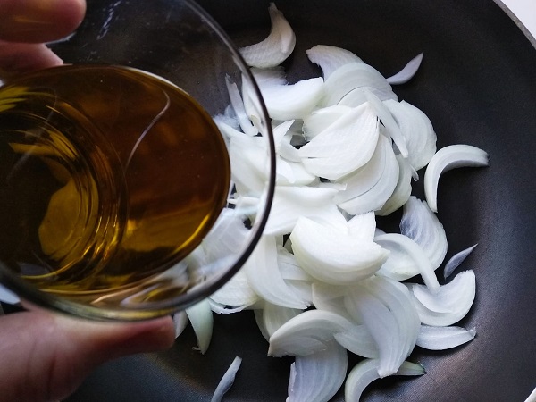 Στο χρόνο αυτό κόβουμε τα κρεμμύδια σε ένα τηγάνι, προσθέτουμε το 1/2 του λαδιού και τα βάζουμε σε πολύ χαμηλή φωτιά για να μαλακώσουν και να γυαλίσουν χωρίς να πάρουν χρώμα.