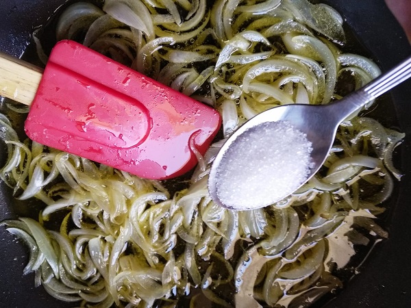 Λίγο πριν είναι έτοιμα τους ρίχνουμε ένα κουταλάκι του γλυκού ζάχαρη και τα ψήνουμε ακόμη 5 λεπτά.