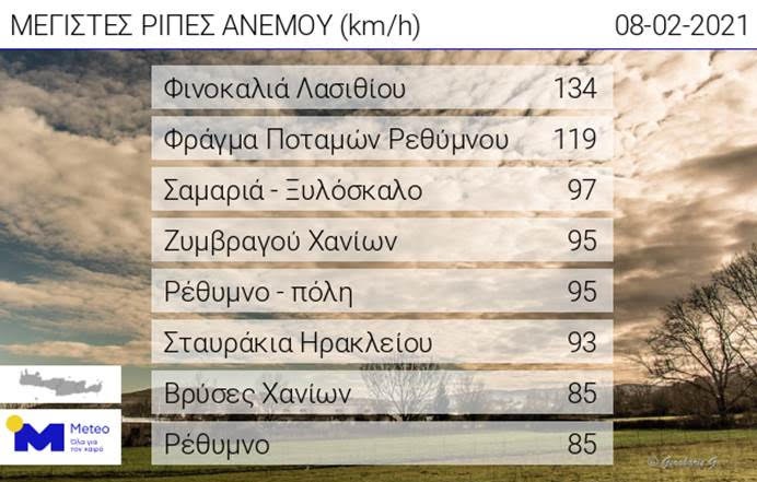 Εντυπωσιακά ωστόσο είναι τα στοιχεία από καταγραφές του meteo.gr, στις οποίες φαίνεται πως στον Φινοκαλιά Λασιθίου, οι άνεμοι είχαν ριπές μέχρι και τα 134 χιλιόμετρα/ώρα.
