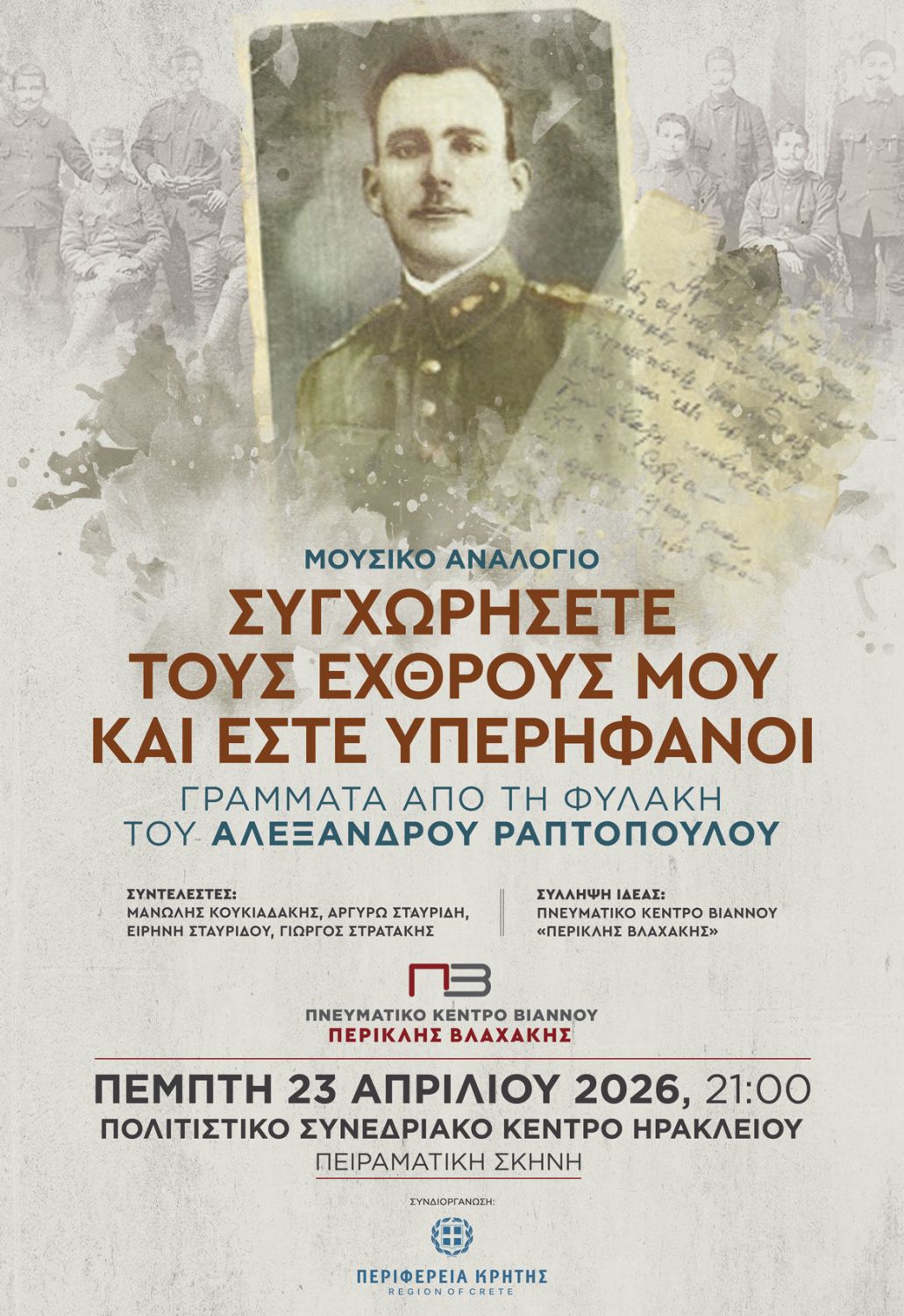 Το Πνευματικό Κέντρο Βιάννου «Περικλής Βλαχάκης» σε συνδιοργάνωση με την Περιφέρεια Κρήτης παρουσιάζει το μουσικό αναλόγιο με γράμματα του Αλέξανδρου Ραπτόπουλου από τη φυλακή, σε ένα ταξίδι ανάμεσα στις λέξεις του και σε μουσικές επιλεγμένες να δημιουργήσουν μια μοναδική βραδιά για το κοινό και τους συντελεστές. Μετά την επιτυχημένη παρουσίαση του αναλογίου στο Πνευματικό Κέντρο Βιάννου «Περικλής Βλαχάκης», το Καλοκαίρι 2025, η συγκινητική ατμόσφαιρα της βραδιάς εκείνης θα μεταφερθεί και στο Ηράκλειο ώστε να παρουσιαστεί στο ευρύτερο κοινό.