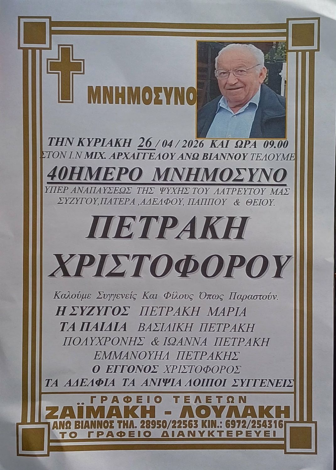 Συμπληρώθηκαν 40 ημέρες από την αποδημία του Χριστόφορου Πολ. Πετράκη. Την ερχόμενη Κυριακή 26 Απριλίου 2026 και ώρα 9:00 π.μ. στον Ιερό Ναό Μιχαήλ Αρχαγγέλου Άνω Βιάννου τελείται τεσσαρακονθήμερο μνημόσυνο για την ανάπαυση της ψυχής του.