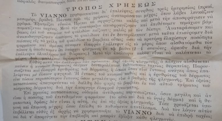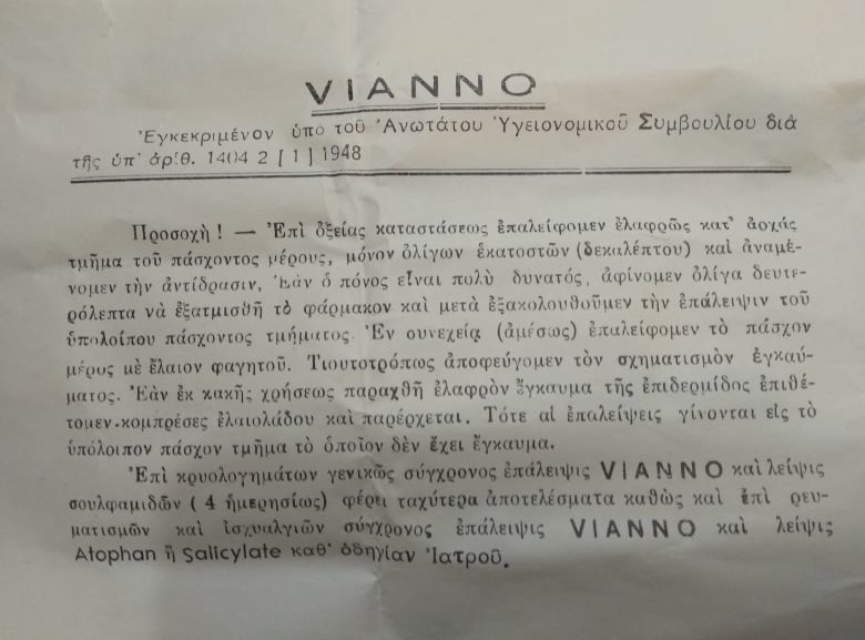 Το VIANNO πήρε έγκριση από το τότε Υπουργείο Υγιεινής τον Ιανουάριο του 1948, ενώ όπως θυμούνται οι μεγαλύτεροι, είχε χαρακτηριστικό άρωμα από ευκάλυπτο και θύμιζε έντονα αντίστοιχα σκευάσματα μεγάλων βιομηχανιών για τη γρίπη ή το κρυολόγημα, που τις επόμενες δεκαετίες κατέκλυσαν την αγορά, μέχρι και τις ημέρες μας.