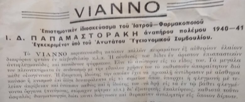 Το "VIANNO" ήταν ένα επιστημονικό ιδιοσκεύασμα του ιατρού-φαρμακοποιού, Ι.Δ. Παπαμαστοράκη ο οποίος ήταν ανάπηρος πολέμου (1940-1941).