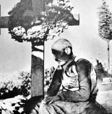 Ο Χαράλαμπος Χρηστάκης, που ήταν μαζί με 6 Κατωβαχουδιανούς, που για καλή τους τύχη διασώθηκε, σε έναν από τους ομαδικούς τάφους στον προαύλειο χώρο της εκκλησίας Μεταμόρφωσης του Σωτήρα κατά την επίσκεψη μελών της «Κεντρικής Επιτροπής Διαπιστώσεως Ωμοτήτων εν Κρήτη» στον Βαχό το καλοκαίρι του 1945 (Η φωτογραφία είναι του Κώστα Κουτουλάκη)