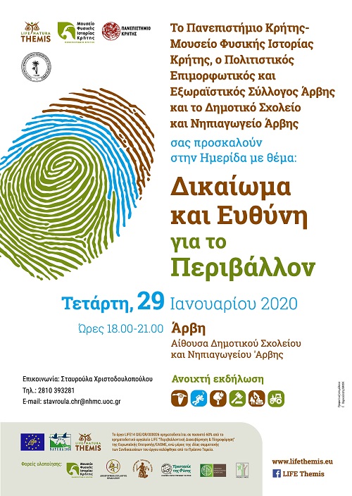 Το Πανεπιστήμιο Κρήτης-Μουσείο Φυσικής Ιστορίας Κρήτης (ΠΚ-ΜΦΙΚ) συνεχίζοντας την εκστρατεία ενημέρωσης «Δικαίωμα και Ευθύνη για το Περιβάλλον» για την ευαισθητοποίηση των πολιτών της Κρήτης αναφορικά με την εφαρμογή της περιβαλλοντικής νομοθεσίας και την αντιμετώπιση των περιβαλλοντικών εγκλημάτων, συνδιοργανώνει με τον Πολιτιστικό, Επιμορφωτικό και Εξωραϊστικό Σύλλογο Άρβης τη 10η ημερίδα ενημέρωσης, στην Άρβη του Δήμου Βιάννου, την Τετάρτη 29 Ιανουαρίου 2020.