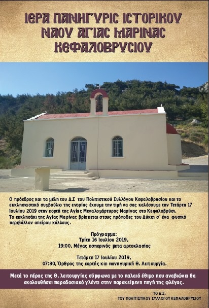 Το πρόγραμμα για τη γιορτή της Αγιάς Μαρίνας στο Κεφαλοβρύσι, γνωστοποίησε ο τοπικός Πολιτιστικός Σύλλογος.