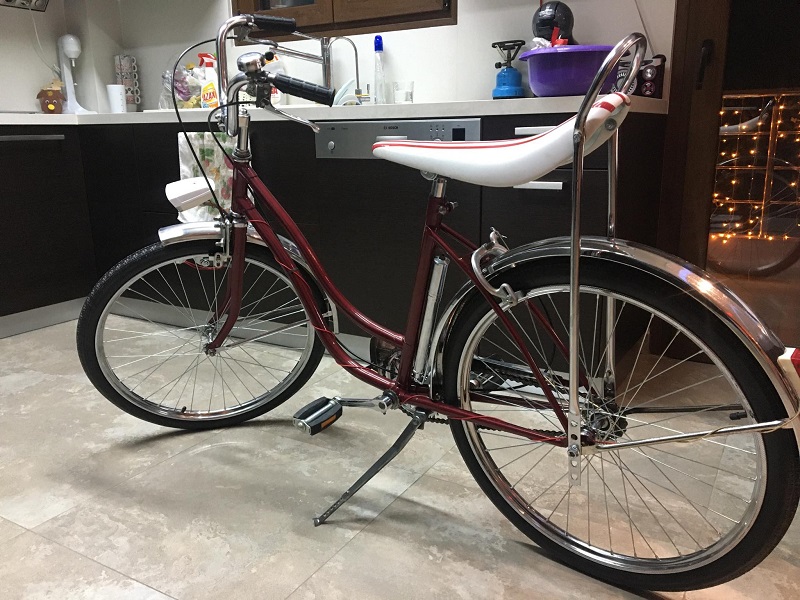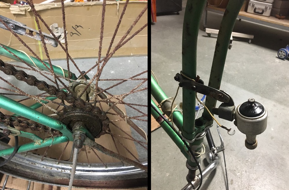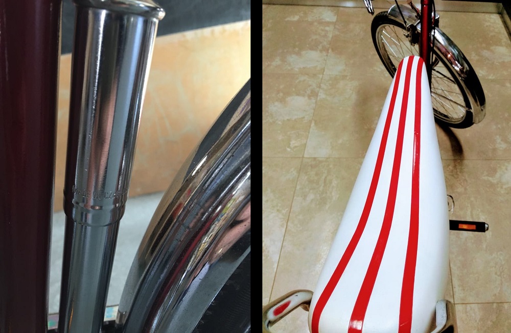 Κατά τη φωτογράφηση, παρατηρούμε αρκετές λεπτομέρειες που το κάνουν ιδιαίτερο όπως για παράδειγμα η τρόμπα που είναι ενσωματωμένη πάνω στο ποδήλατο αλλά και η χαρακτηριστική μεγάλη σέλα, που έδινε τη δυνατότητα στον οδηγό να μεταφέρει... άλλο ένα άτομο!